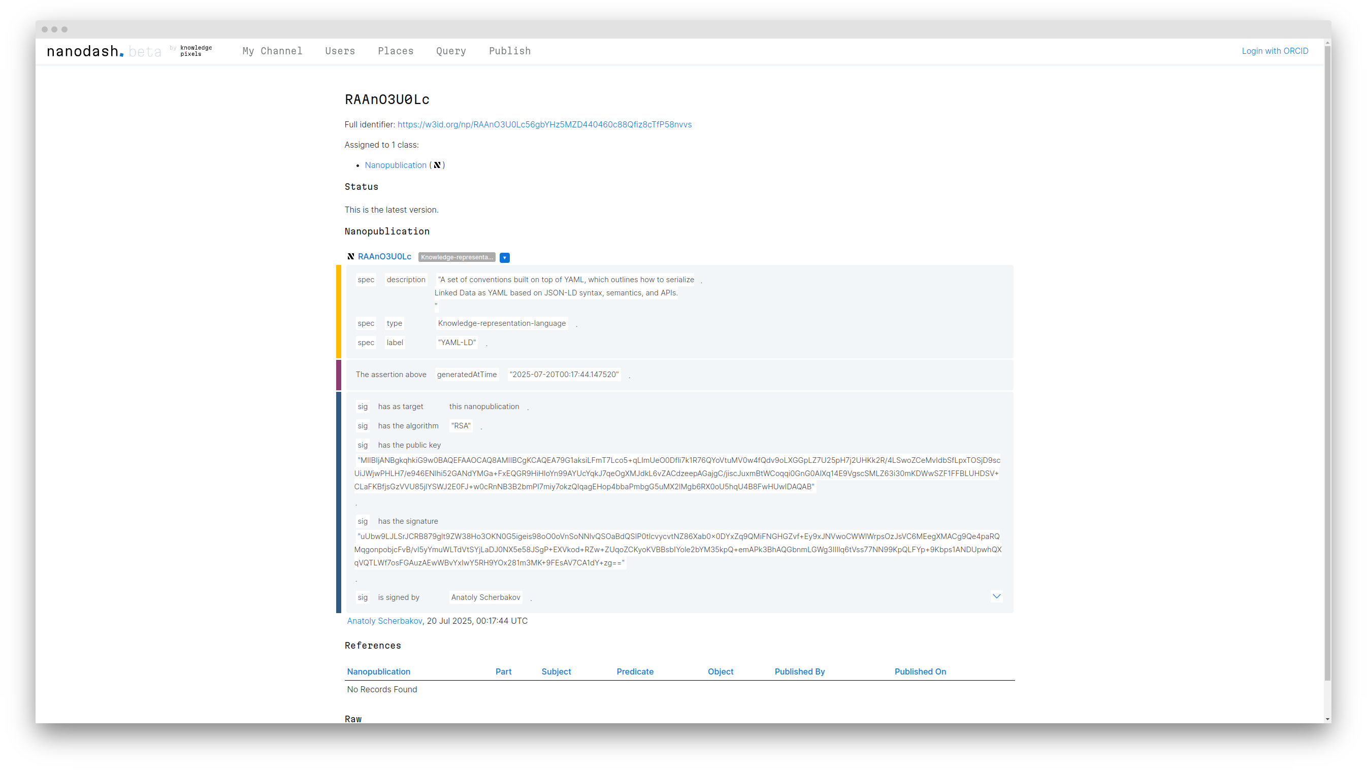 Nanopublications are cryptographically signed and published in the decentralized Nanopublication Registry. Thus, when you or I publish a nanopublication,